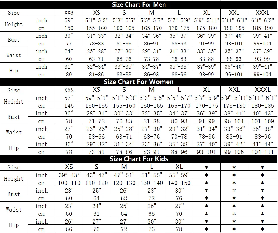 Tabla de tallas diferente para diferentes géneros, así que déjenos una nota de su género (hombre, mujer, niño) cuando elija la talla. (Por ejemplo. Niño XL)