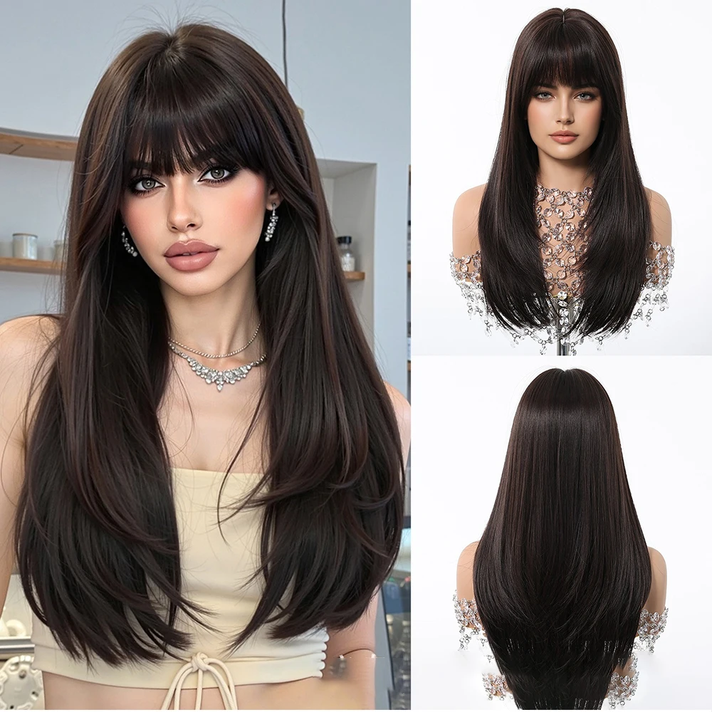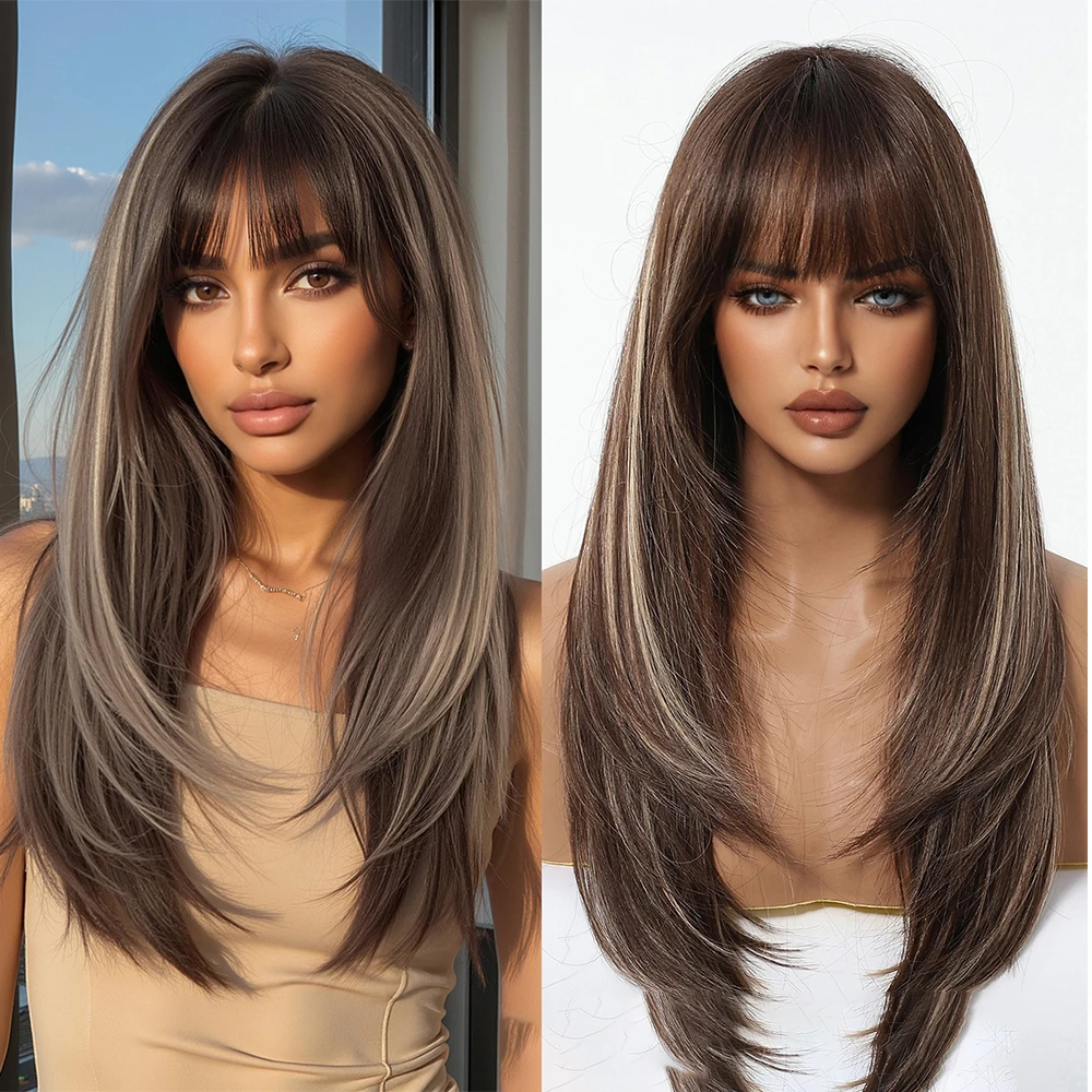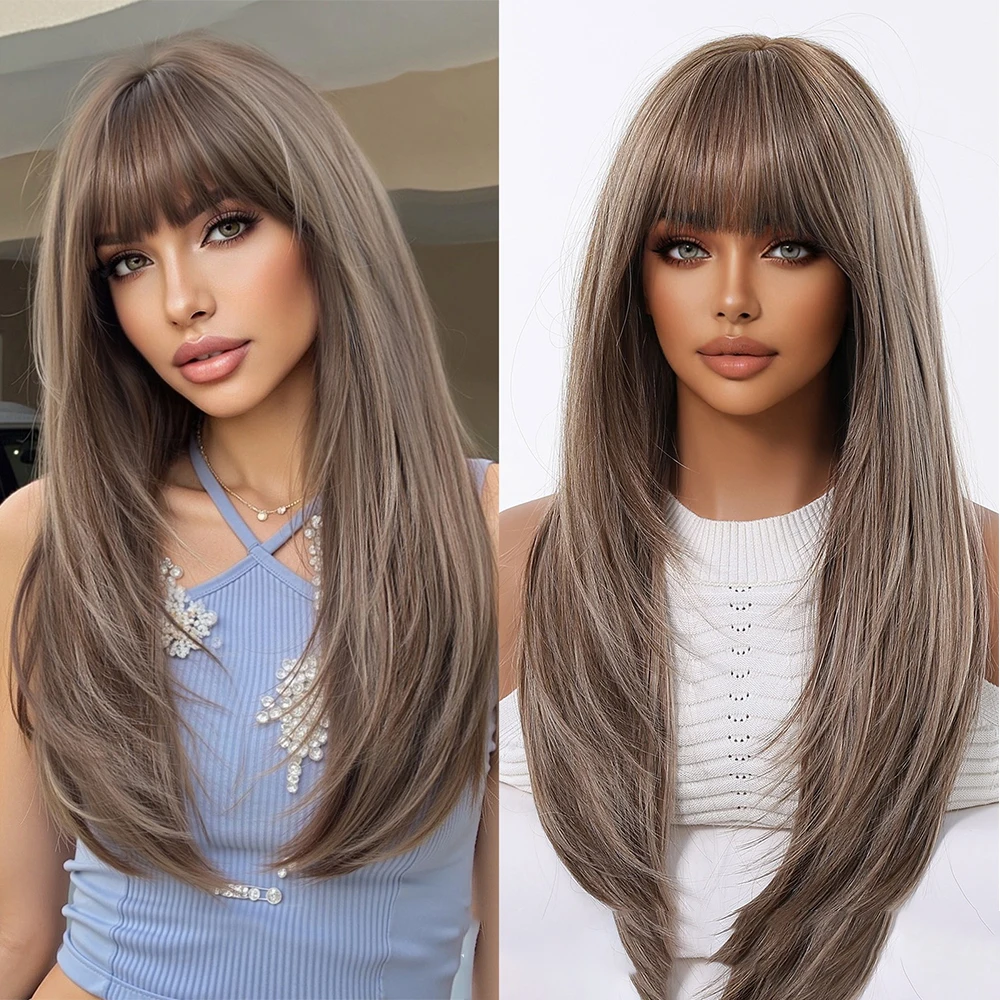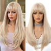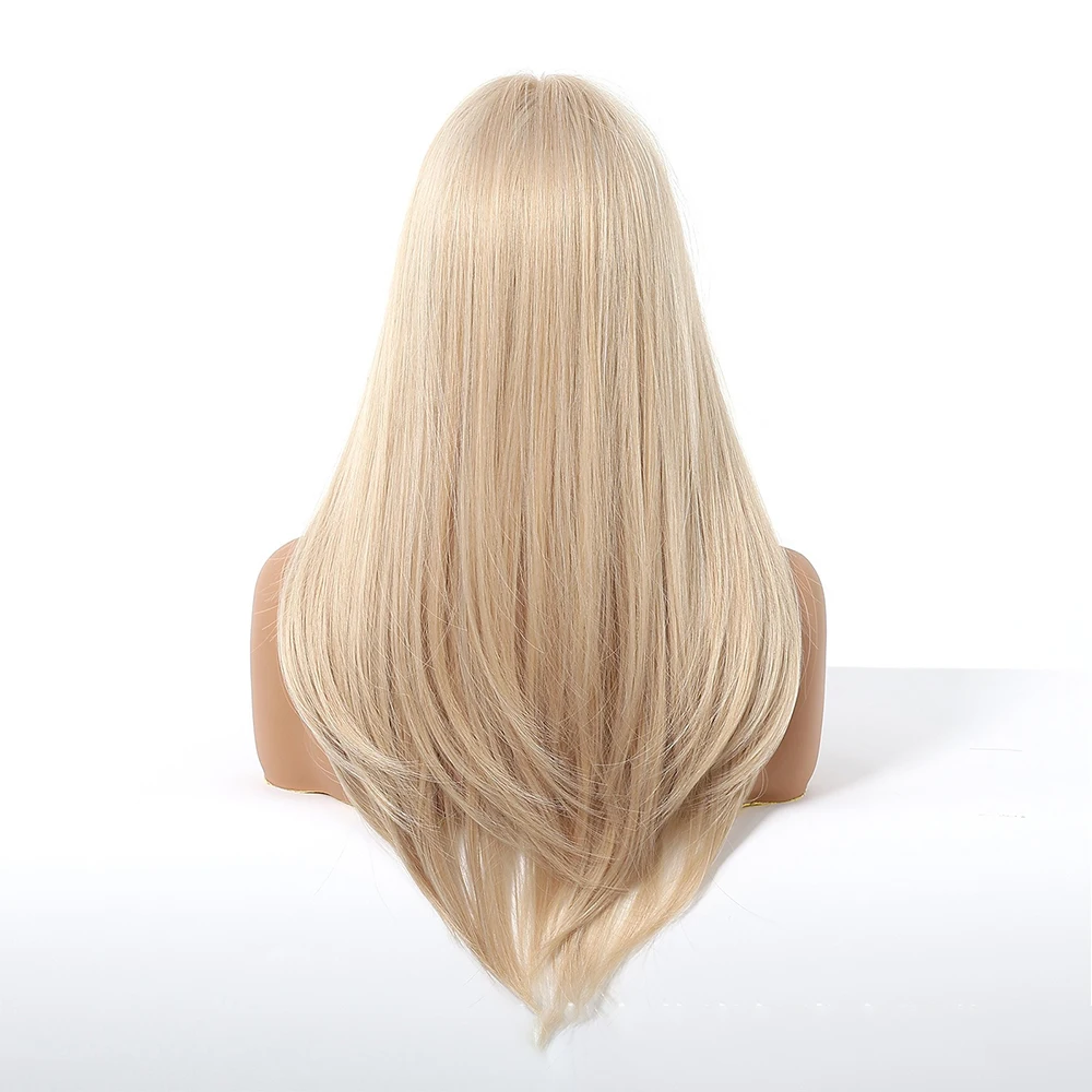 Peluca rubia dorada con flequillo, peluca Natural de pelo largo y liso para mujer, pelucas de Cosplay, pelo falso sintético resistente al calor