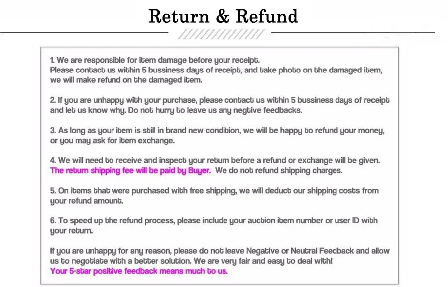 • Si no deseas el producto que has recibido, puedes solicitar un reembolso, pero debes devolver el artículo a tu cargo y el artículo debe estar sin usar.